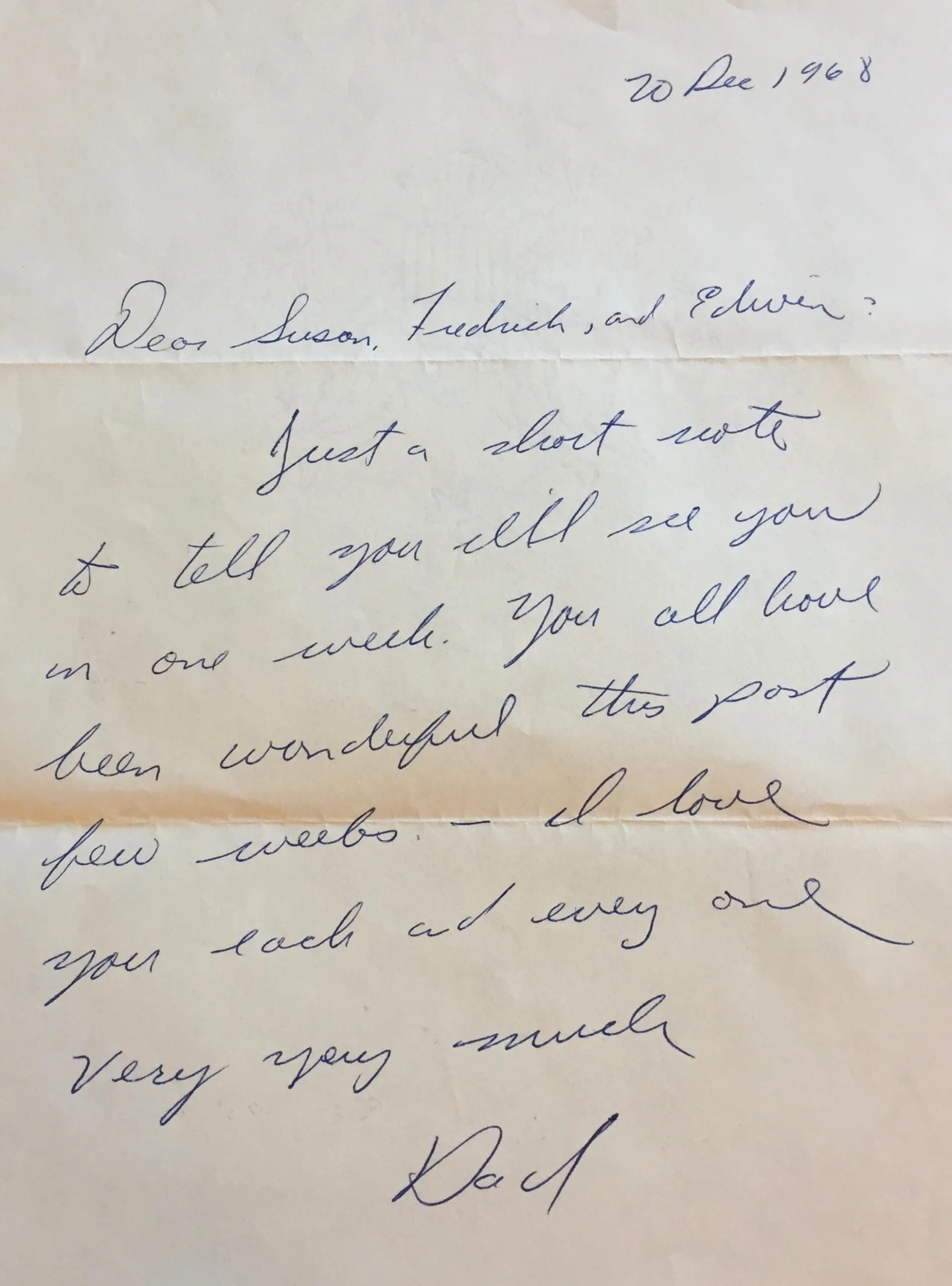 The note Frank wrote to Susan and the boys the night before Apollo 8 departed for the Moon.