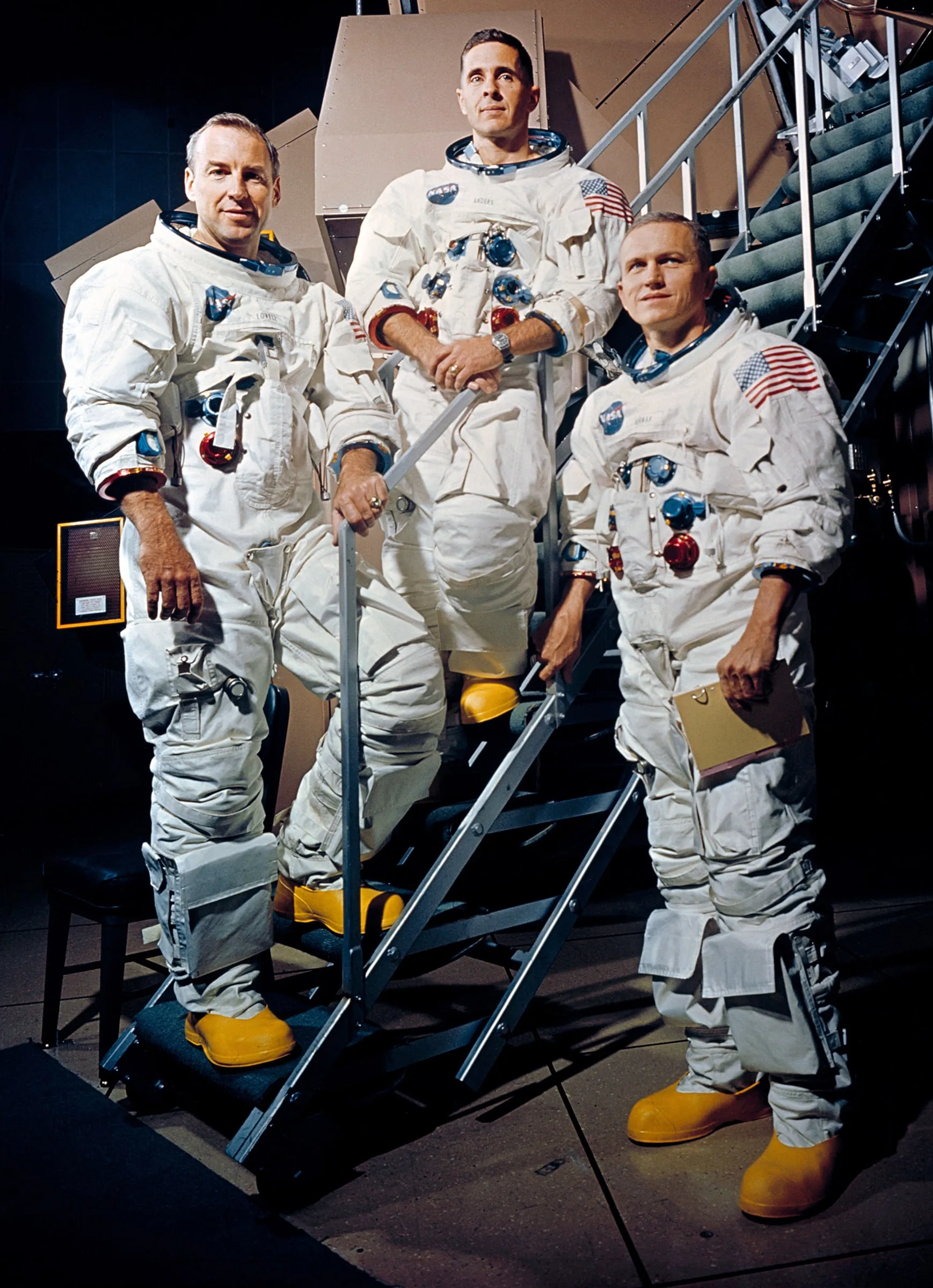 The first humans to leave Earth and travel to the Moon on Apollo 8 (left to right): command module pilot Jim Lovell, lunar module pilot Bill Anders, and commander Frank Borman.