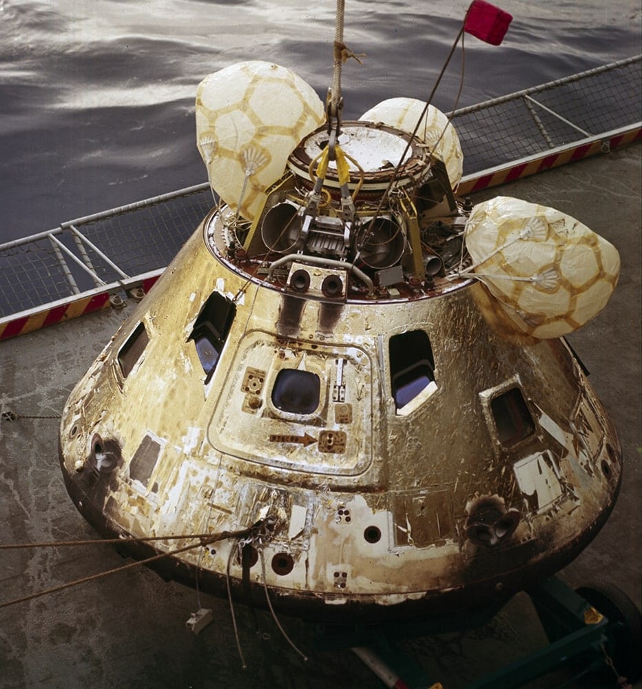 Apollo 1 command module being inspected after the fire that claimed the lives of the crew.