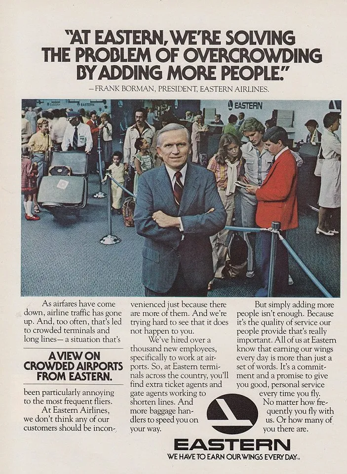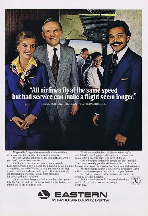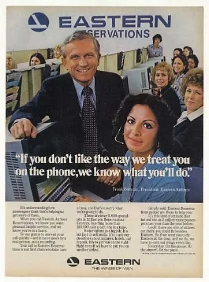 Frank was Eastern Airlines spokesman in many of the company ads during his tenure as CEO from 1975 to 1986.