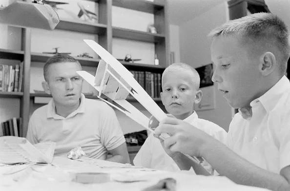 Frederick assembles a model airplane under the watchful of Frank and Edwin.
