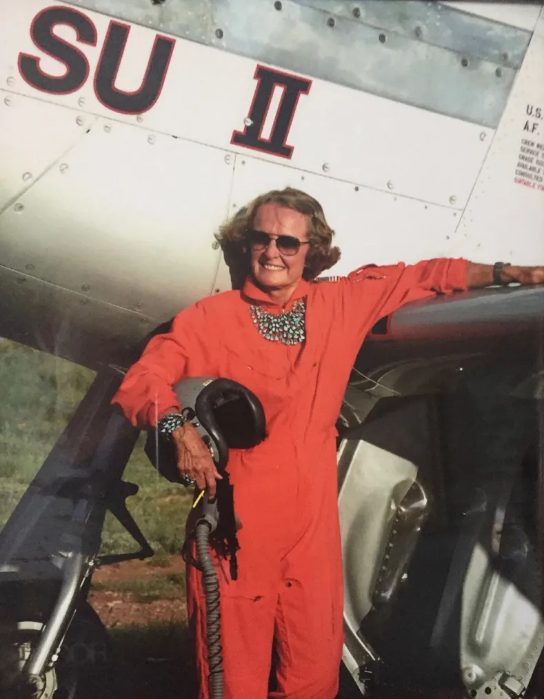 Susan poses in front of Su Su II wearing her beloved turquoise jewelry.